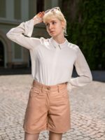 Pohodlné kožené kraťasy jednoduchého střihu s vyvýšeným sedem. Zapínání je řešeno na zip a jeden knoflík. Kraťasy mají hladkou podšívku, nemusíte se proto bát nežádoucího mačkání a shrnování látky. Provedení kapes je standardní: dvě zadní, dvě přední plus jedna malá.