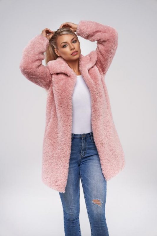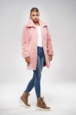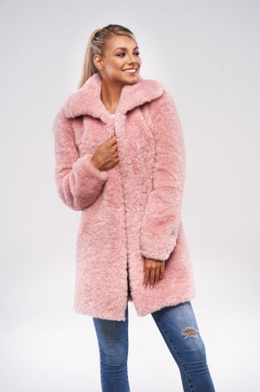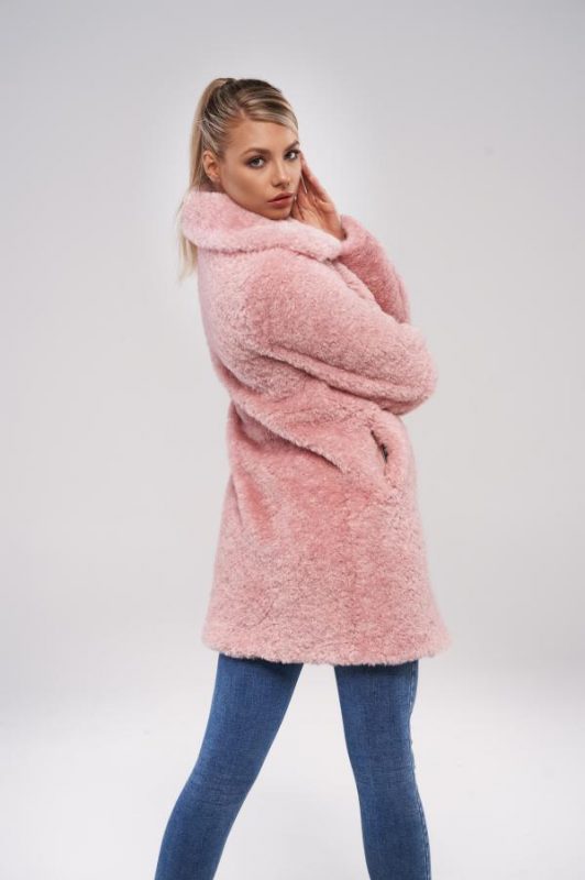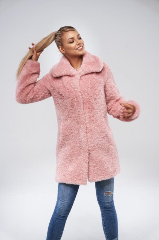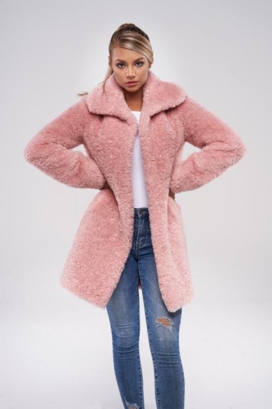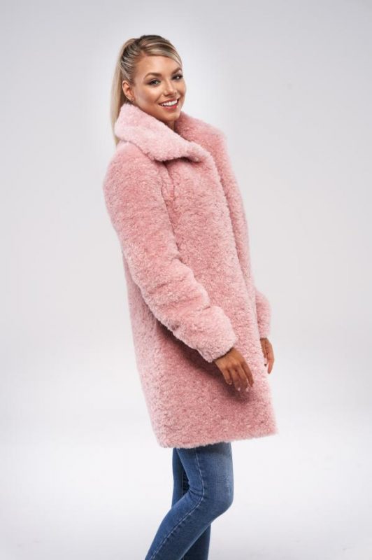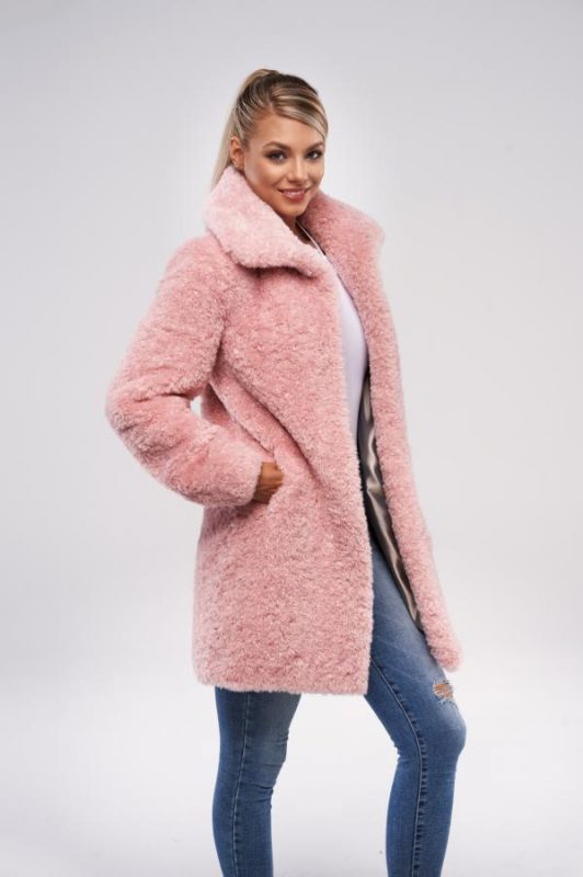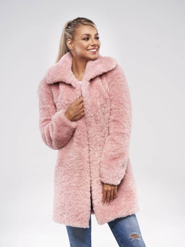 Nepravidelné kroucení vláken připomíná jehněčí vzhled a velké klopy límce dodávají kožichu ještě více charakter pravé kožešiny. Tento střihový kabát má dvě boční kapsy a zapínání na 4 cvočky.